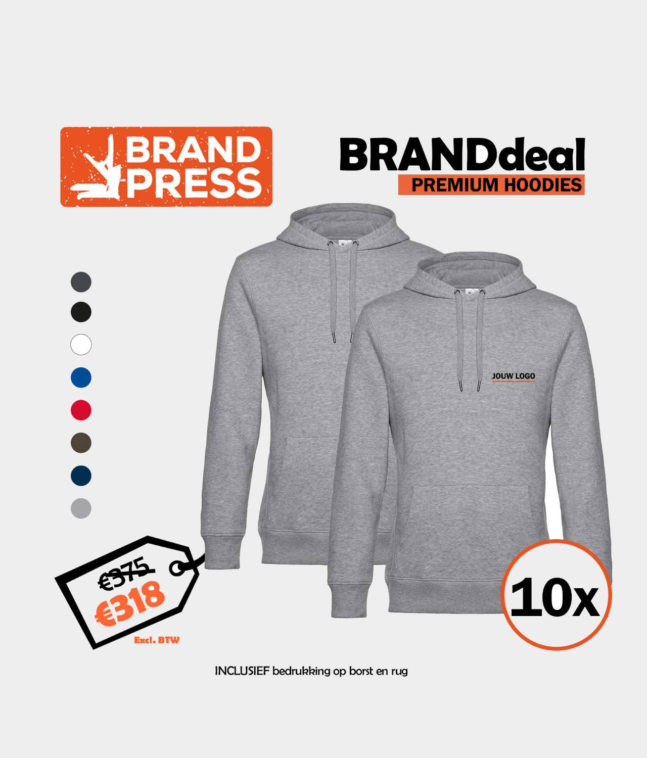 Met deze speciale aanbieding ontvangt u 10 premium hoodies bedrukt met uw logo. Een geweldige manier om uw bedrijf of organisatie te introduceren bij anderen. De hoodies zijn gemaakt van hoogwaardige materialen en het logo wordt er professioneel op gedrukt. U kunt er zeker van zijn dat uw logo er fantastisch uitziet.