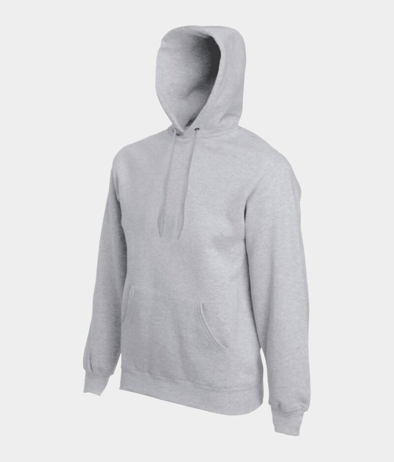 Heather Grey – 260 g/m². 70% katoen / 30% polyester. Gevoerde capuchon met platte ton-sur-ton koordjes. Nektape in jersey in de kraag. Kangoeroezak. Mouwboorden en onderzijde in ribboord katoen/elasthan.