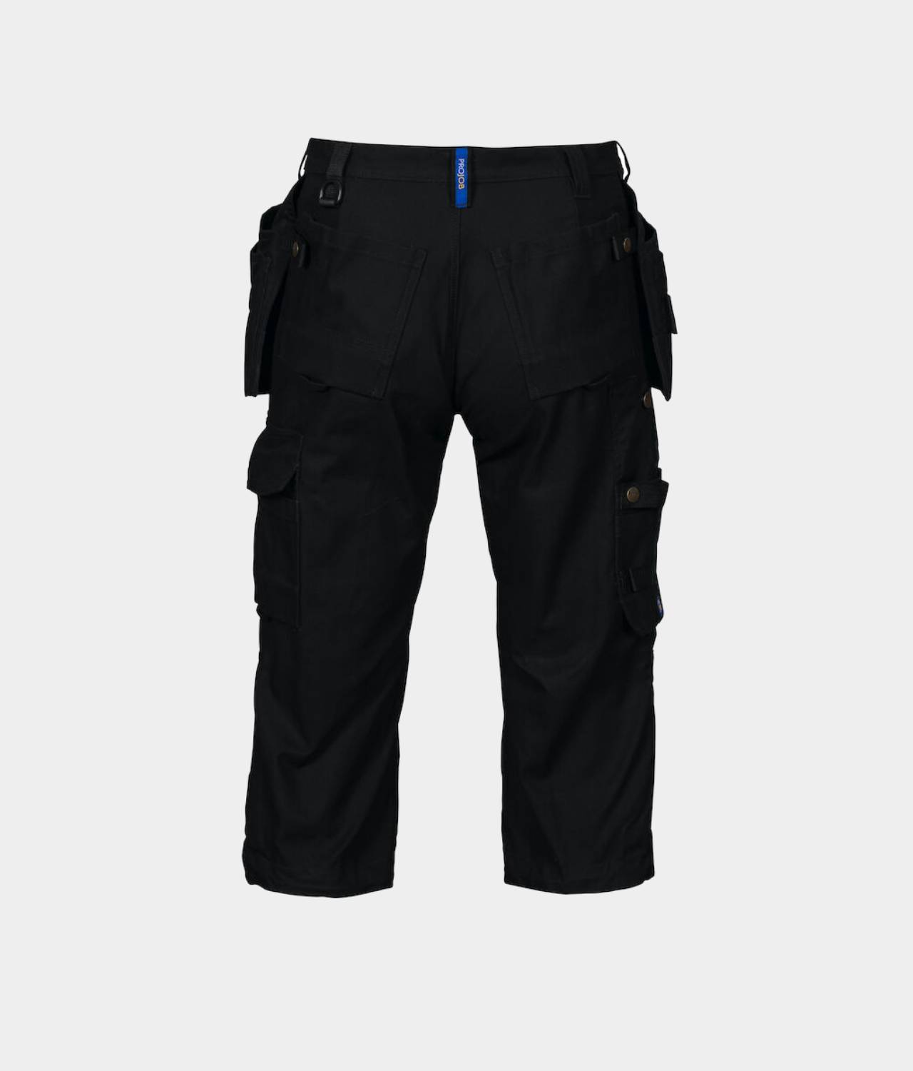 • twee zijbeenzakken: linker: ruimte voor telefoon, pennen, gereedschappen; rechter: twee aanpasbare hamerhouders, potloodzakje, duimstokzak en mesknoop